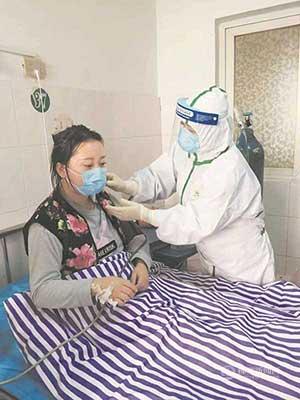 2020年2月2日,護(hù)士長(zhǎng)劉湘云為我市第一例新冠肺炎確診患者做心理疏導(dǎo)、協(xié)助更換口罩。