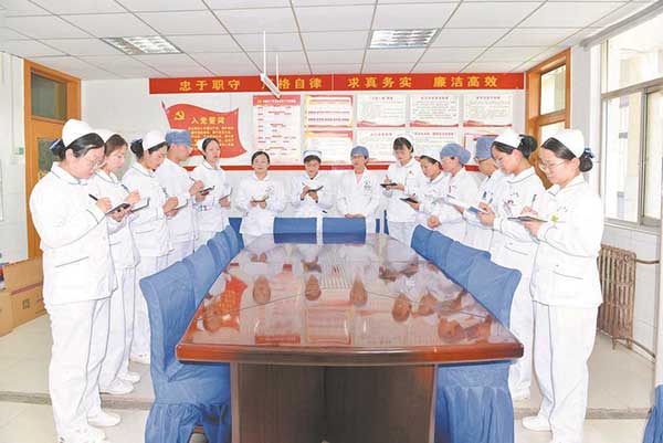 “××床下肢栓塞,交班護(hù)士要交代家人不要拍打下肢……”早上7點(diǎn)半,市立醫(yī)院南區(qū)感染科進(jìn)行早交班。夜班醫(yī)護(hù)值班人員對(duì)病區(qū)患者病情進(jìn)行交接,護(hù)士長(zhǎng)劉湘云對(duì)護(hù)理交班內(nèi)容進(jìn)行點(diǎn)評(píng)及重點(diǎn)工作提醒,護(hù)士們認(rèn)真記錄。科主任總結(jié)并交代注意事項(xiàng)。會(huì)后,大家各司其職,抽血、配藥、輸液……開(kāi)始了一天忙碌的工作。