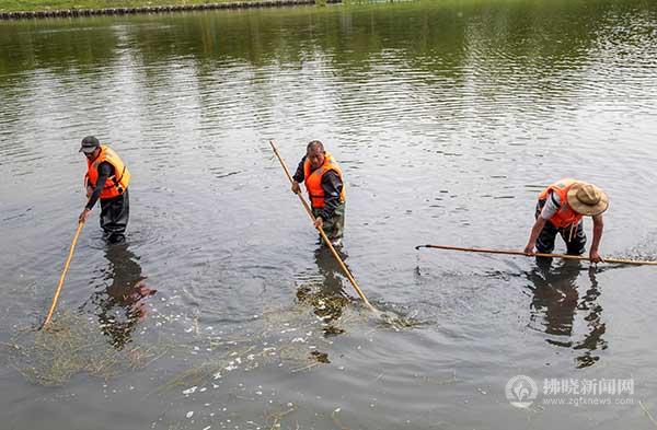 清晨6點(diǎn),兩人就到達(dá)地點(diǎn),麻利地穿上皮衩,帶著撈罩下湖打撈水面垃圾、綠苔及雜草等漂浮物。他們從三角洲公園南長(zhǎng)廊沿湖堤一直行至西北土山,然后進(jìn)入湖中3個(gè)島區(qū),環(huán)島入水打撈垃圾雜草等水上漂浮物。環(huán)湖堤長(zhǎng)達(dá)6公里以上,每天站在1米多深的水中,一干就是三四個(gè)小時(shí)。
