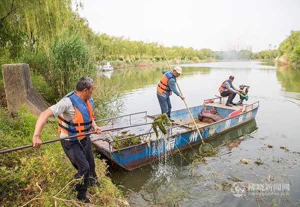 河道清理工在宿州大道南側(cè)的新北沱河段水域清理雜草等水面漂浮物。