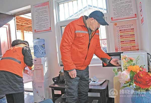在環(huán)城北路愛心驛站,環(huán)衛(wèi)工人在接熱水、熱飯。