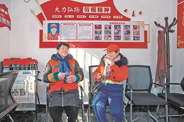 工作間隙,環(huán)衛(wèi)工人喝著熱水,享受驛站里的溫暖時光。