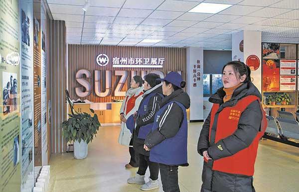 在汴北愛心驛站,管理員帶領(lǐng)環(huán)衛(wèi)工人觀看環(huán)衛(wèi)發(fā)展史。