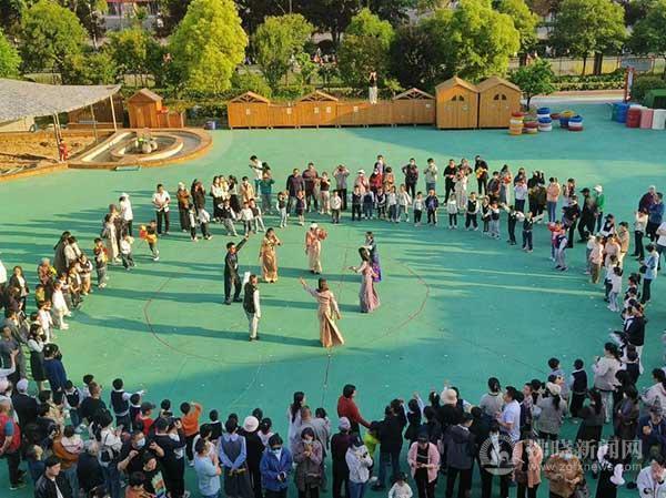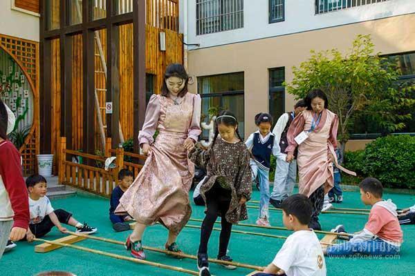 措美縣教師次珠在埇橋區第二幼兒園帶領孩子們跳竹竿。