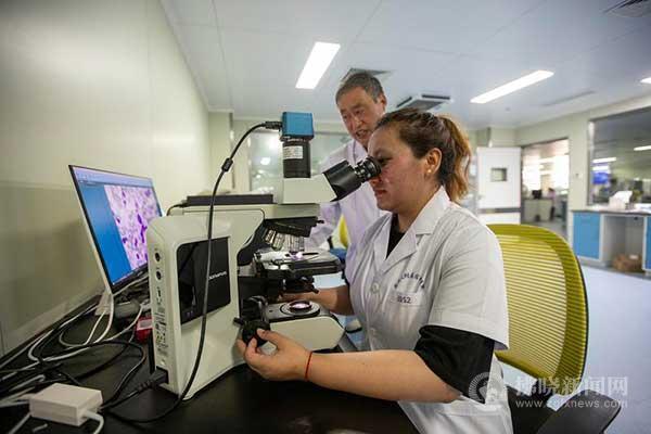 措美縣醫生德吉在市立醫院(北區)檢驗科使用生物顯微鏡觀察細胞。