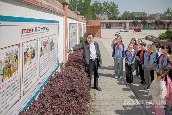 閔賢小學(xué)校園內(nèi),老師在給低年級(jí)學(xué)生及幼兒園小朋友講解文化墻上的“新二十四孝”。