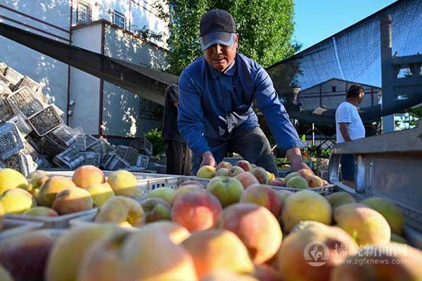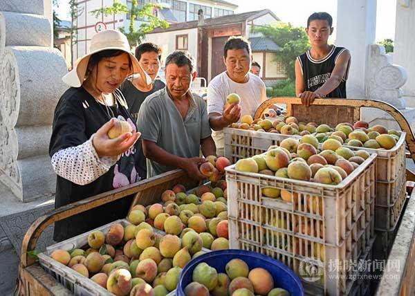 浙江客商(左一)在碭城鎮西南門村收購鮮桃。