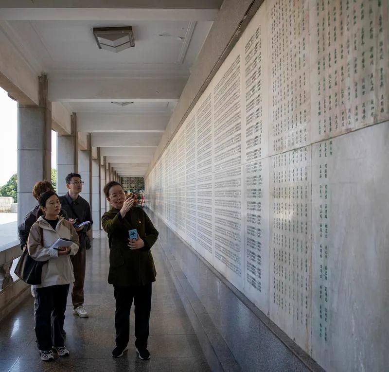 本報記者在烈士墻前聽講解員魏天梅講述烈士子女尋親的故事。記者 蔣幫煜 攝
