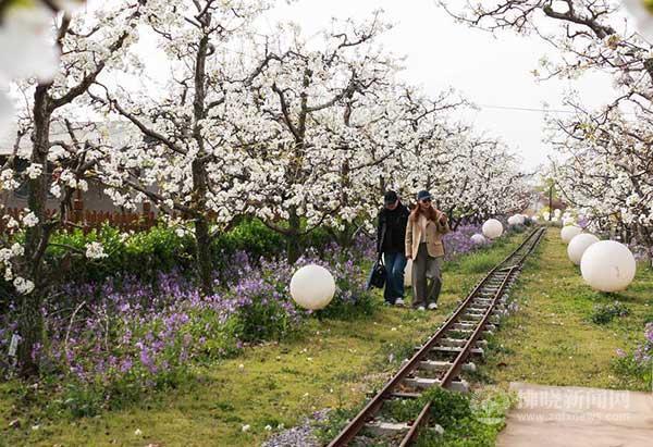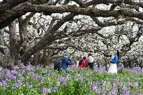 游客倘佯于梨花海中拍照打卡。