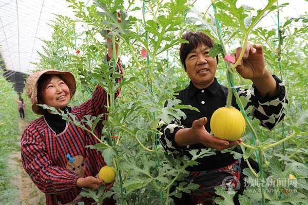 在碭山縣程莊鎮百思農農業科技有限公司西瓜產業園內,連片的西瓜大棚在陽光下熠熠生輝。大棚內,一個個拳頭大小的西瓜和黃色小花點綴在綠色的瓜秧里,呈現出一派生機盎然的喜人景象。工人們穿梭其間、點花掐須,給新一輪盛開的西瓜花授粉,提高坐果率的同時也提升西瓜的品質。